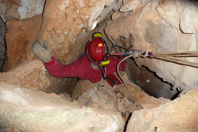 Una vez en la boca de 1,20x1,60 m. Se aprecia a través de ella que el suelo se encuentra a poca profundidad. Para descender es recomendable instalar la cuerda en un joven pino próximo a la boca y colocar un protector en el mismo borde ya que de lo contrario puede sufrir la cuerda. Una vez "aterrizados" en la "Sala de la Entrada" de unas dimensiones de 6x4 m. La primera impresión no es demasiado prometedora a pesar que en nuestra visita encontramos unos ejemplares de un tipo de hongo desconocidos por nosotros que crecían próximos a la luz exterior y que nos "obligaron" a sacar las cámaras de fotos y comenzar a disparar antes de que por algún descuido los destruyeramos. El desarrollo de la cueva transcurre a través de la fractura S/N teniendo que fraccionar colocando una cinta alrededor de una piedra que debido a su tamaño tapona una parte de la fractura que tuvimos que desobstruir en parte para poder progresar. Es recomendable colocar el stop en la baga larga y un mosquetón en el para que elimine el sistema de frenado de forma que nos ayude a superar este estrecho paso. Una vez terminado el descenso nos encontramos en la "Sala del Fondo o Final" de 15,5x7,5 m.
